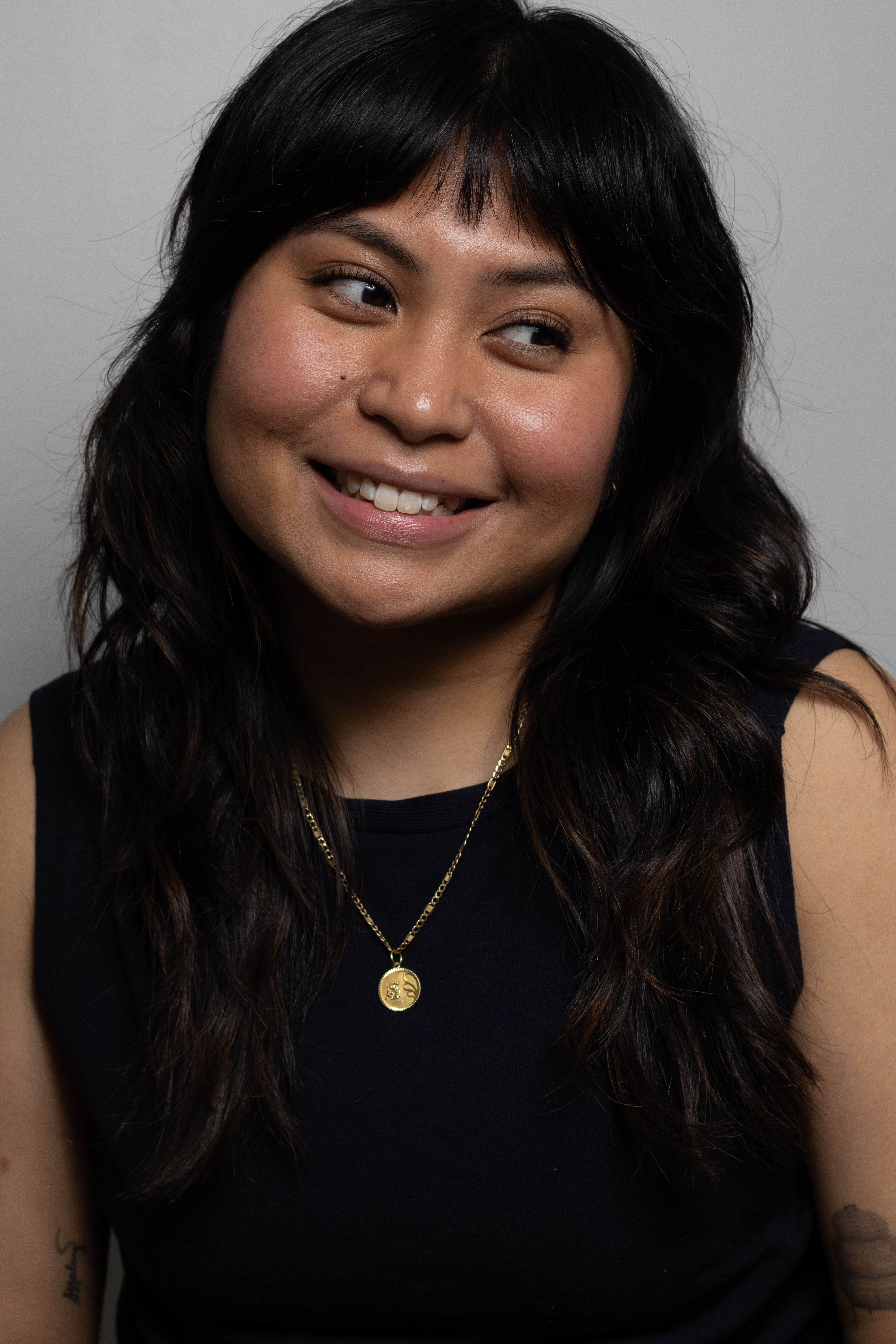 - Woman with black hair and black clothes smiling and looking away from the camera