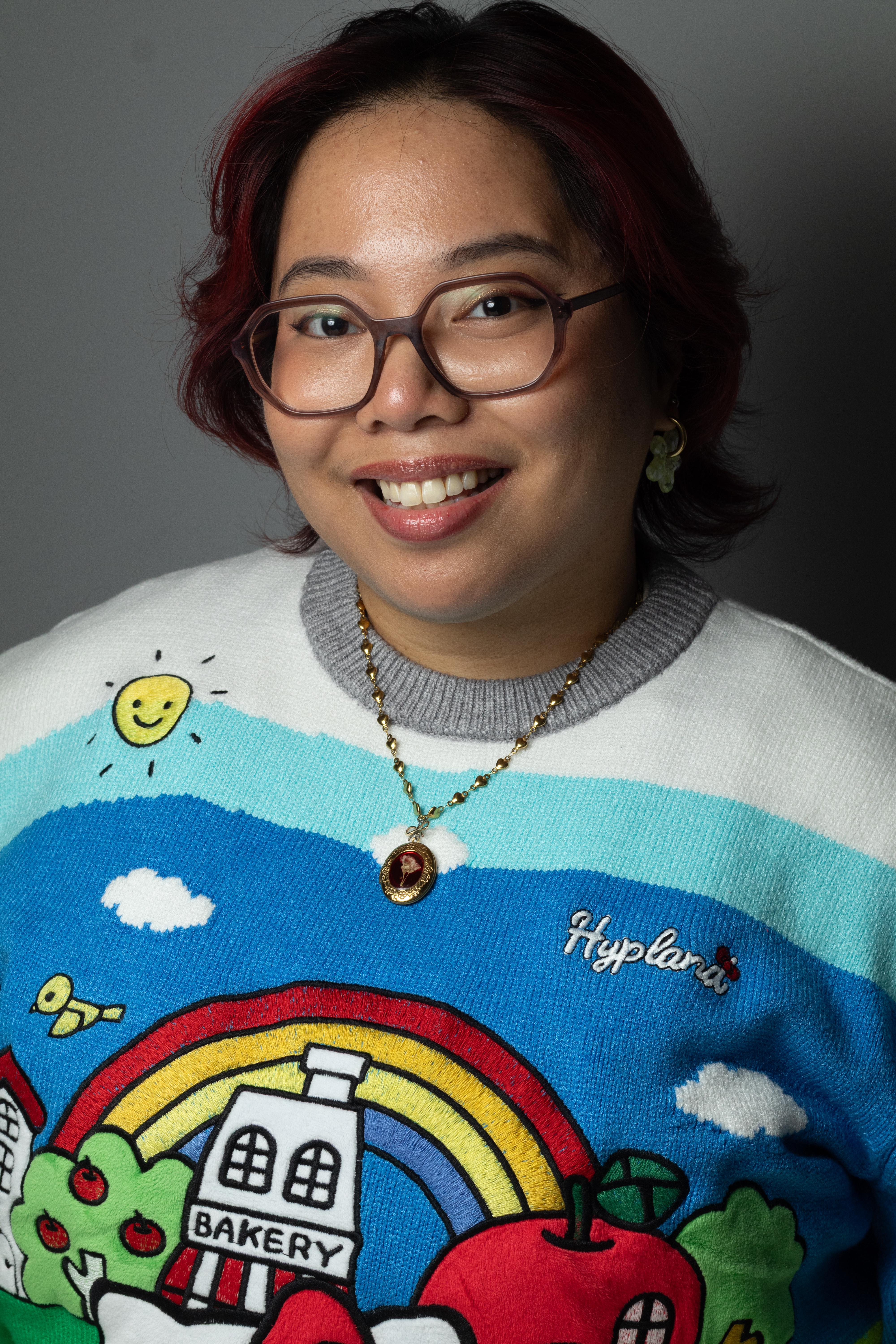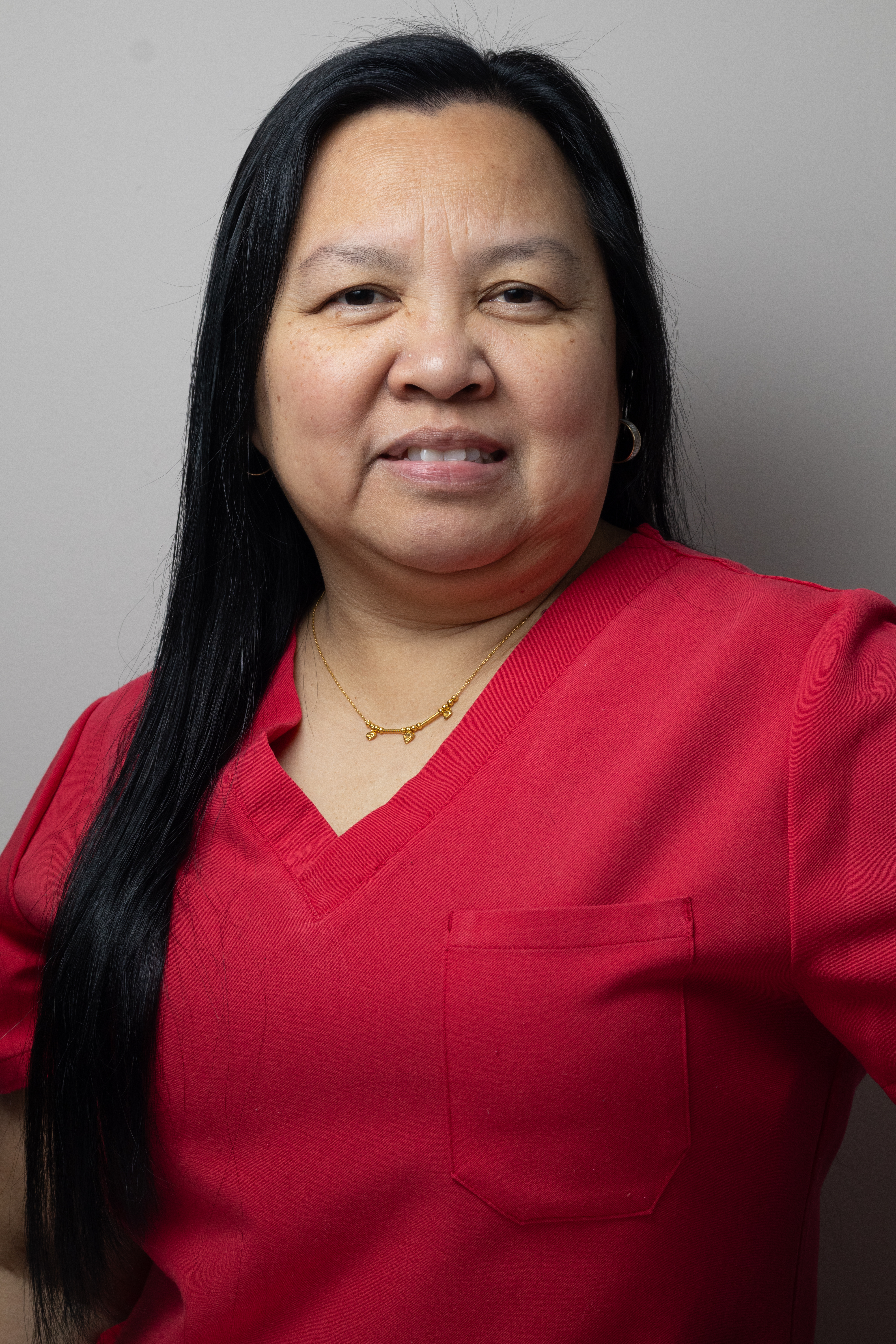 - Woman with long black hair and bright red scrubs looks at the camera with a smile
