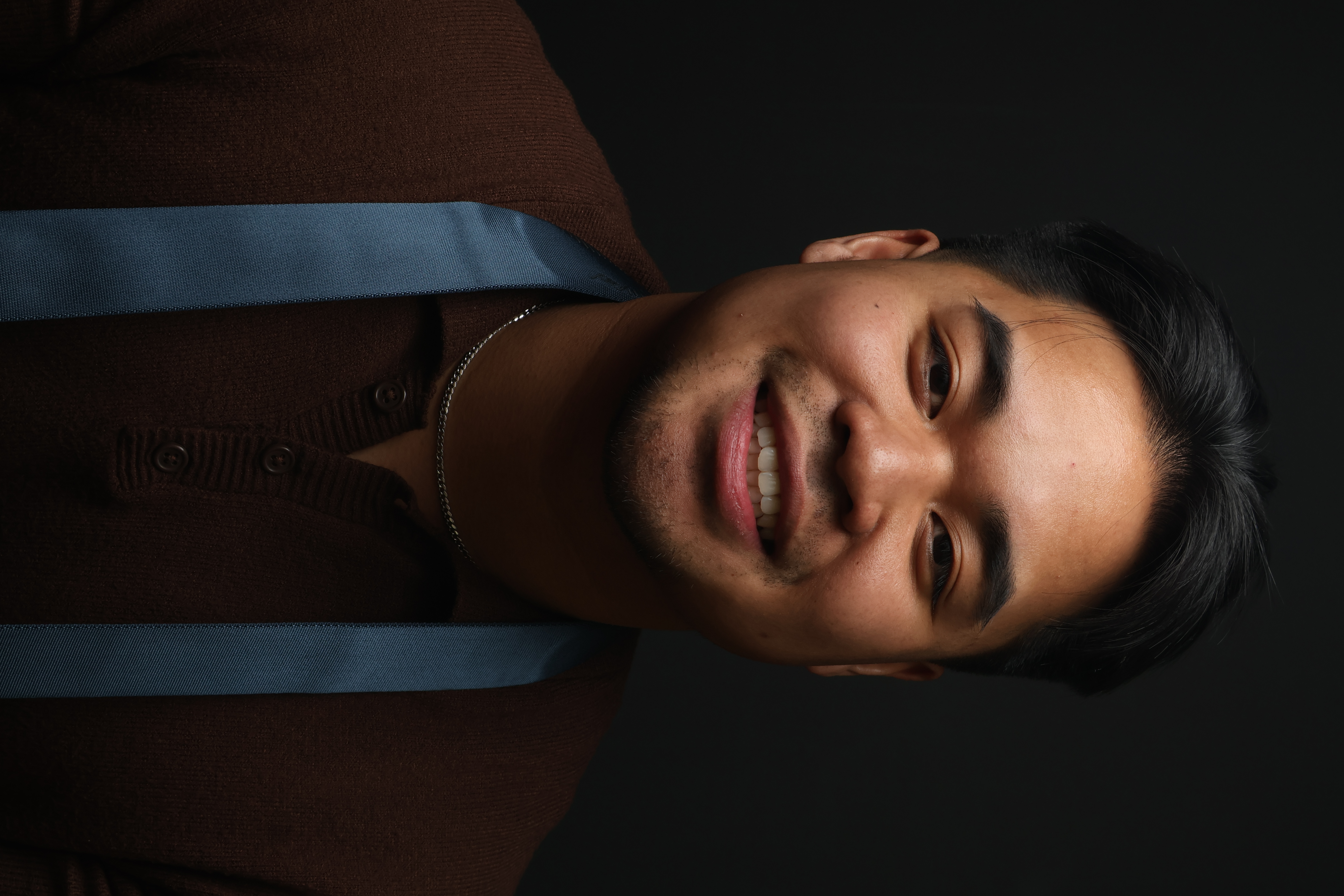 - Man with black hair and wearing brown smiling at the camera